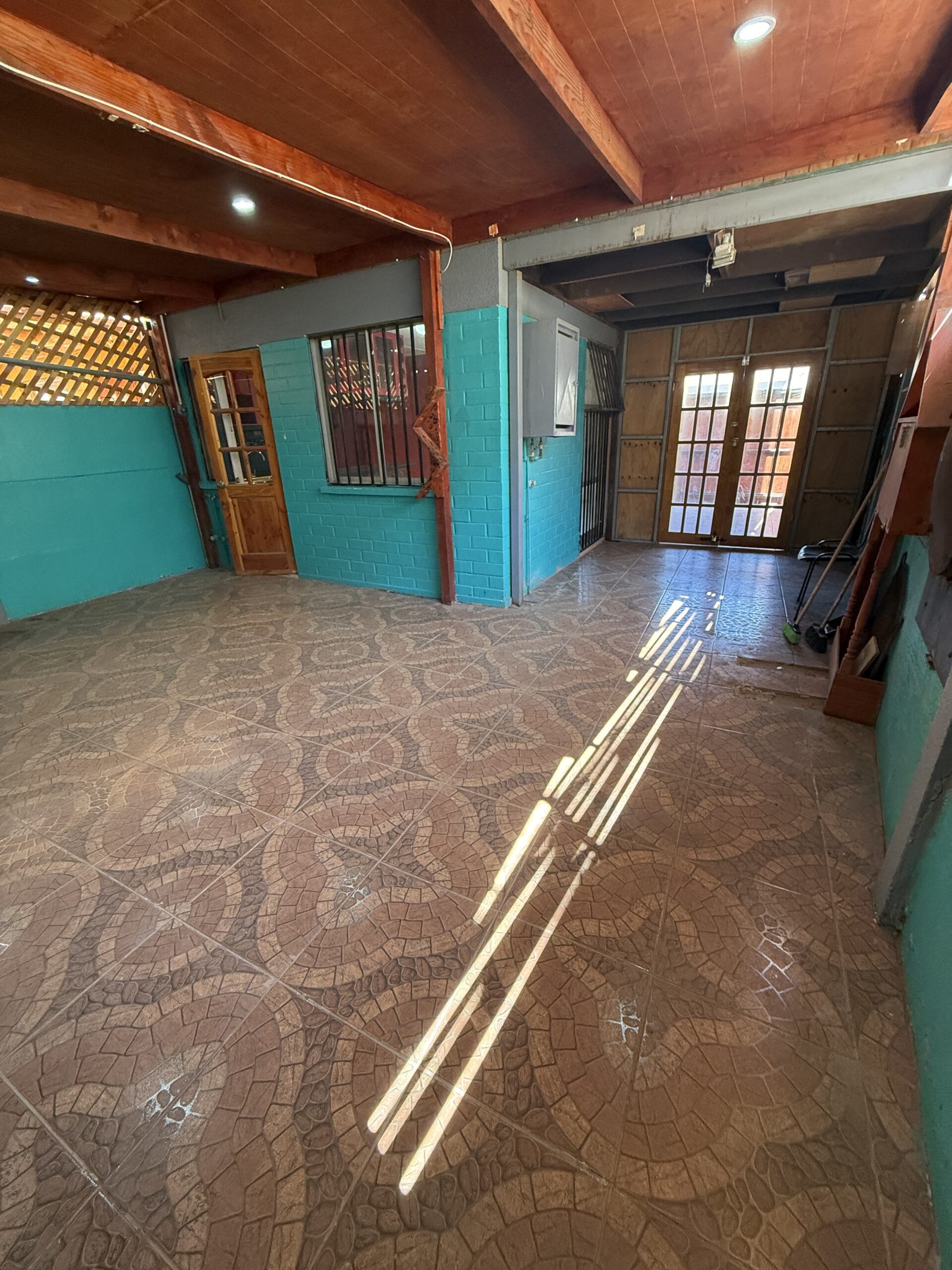 Amplio patio techado de color turquesa, versátil y muy aprovechable, ideal como quincho, terraza, sala multiuso o espacio familiar.
